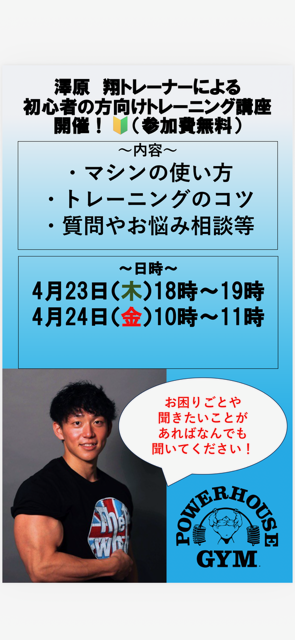 澤原翔トレーナーによる初心者の方向けトレーニング講座開催!(参加費無料)